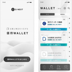 株式会社ジーネクスト(本社:東京都千代田区、代表取締役:横治祐介、東証マザーズ:4179、以下「ジーネクスト」)は、この度、日本初となる電子版の株主優待を一元管理するスマートフォンアプリ『優待Wallet』(仮称)のβ版を開発し、2021年11月の本格ローンチに向けて実証を進めていることをお知らせいたします。本アプリを通じて、株主優待の電子化の促進に加えて、企業と株主双方にとっての利便性及び汎用性の向上を図るほか、企業と株主のアクティブなリレーションシップ構築を促す株主優待管理サービスのマーケットリーダーを目指してまいります。なお、『優待Wallet』(仮称)につきましては、現在特許出願中です。